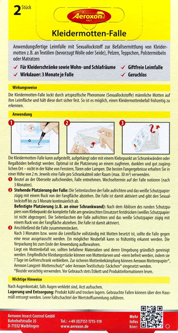Kleben nach kurzer Zeit Motten an der Falle, solltest du aktiv mit der Mottenbekämpfung beginnen, z.B. mit dem Aeroxon Langzeit Mottenschutz.