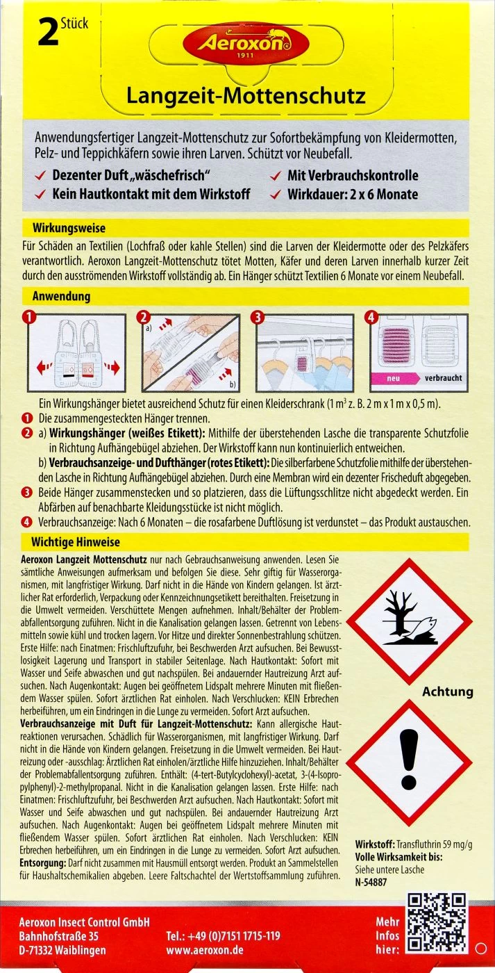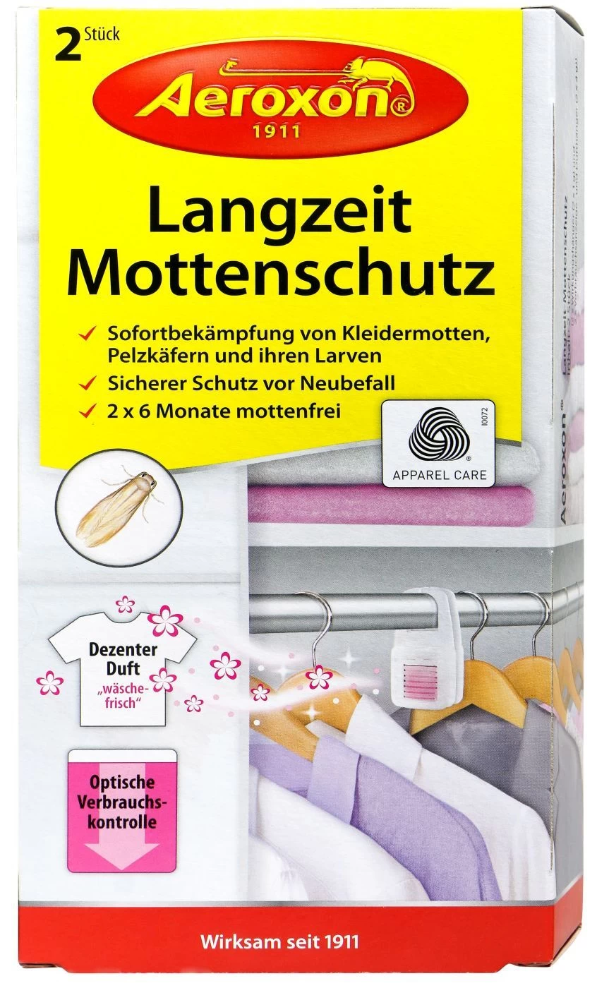 Kein Bock mehr auf Löcher in den Klamotten ? Der Aeroxon Langzeit Mottenschutz bietet deinen Textilien ausreichend Schutz vor lästigen Mottenlarven, die es auf deine Kleidung abgesehen haben. Der Dufthänger verteilt über 6 Monate seine Wirkung in deinem Kleiderschrank, sodass Motten, Käfer und deren Larven das Zeitliche segnen müssen. So das kannst du deine Lieblingshose wieder beruhigt zurück in den Schrank hängen. Wie du den Dufthänger am besten platzierst, siehst du auf der Verpackung!