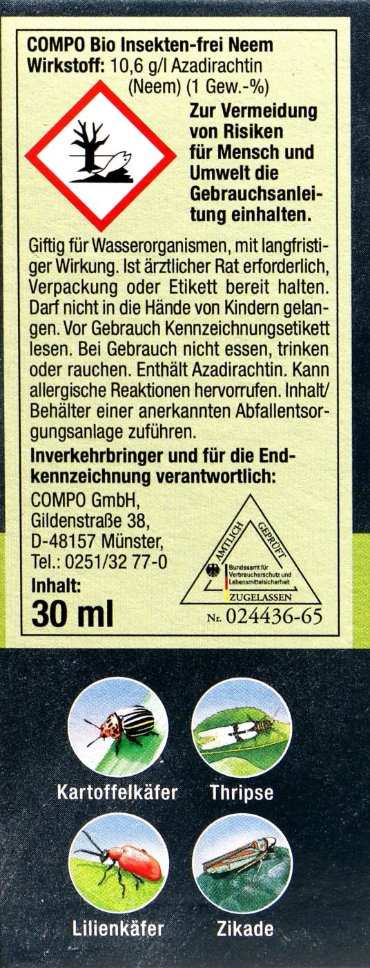COMPO Bio Insekten-frei Neem nutzt genau diese Wirkstoffe, um gegen zahlreiche saugende und beißende Insekten vorzugehen. Die Schädlinge werden inaktiviert, stellen das Fressen ein und sterben daher nach kurzer Zeit.