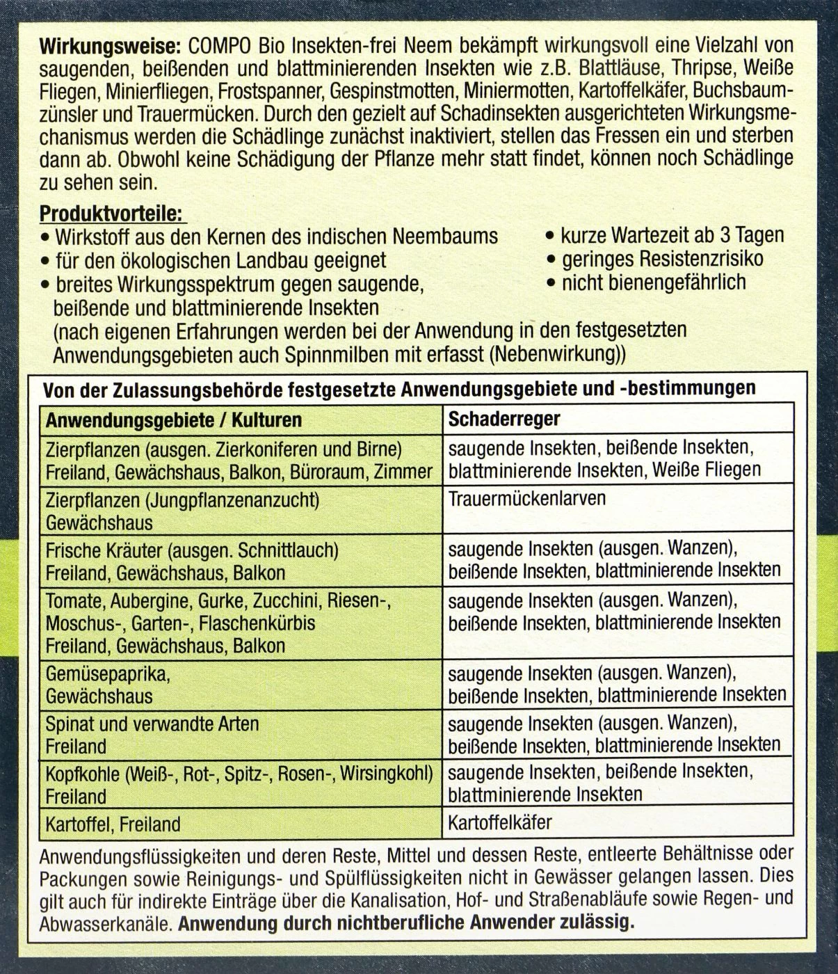 COMPO Bio Insekten-frei Neem nutzt genau diese Wirkstoffe, um gegen zahlreiche saugende und beißende Insekten vorzugehen. Die Schädlinge werden inaktiviert, stellen das Fressen ein und sterben daher nach kurzer Zeit.
