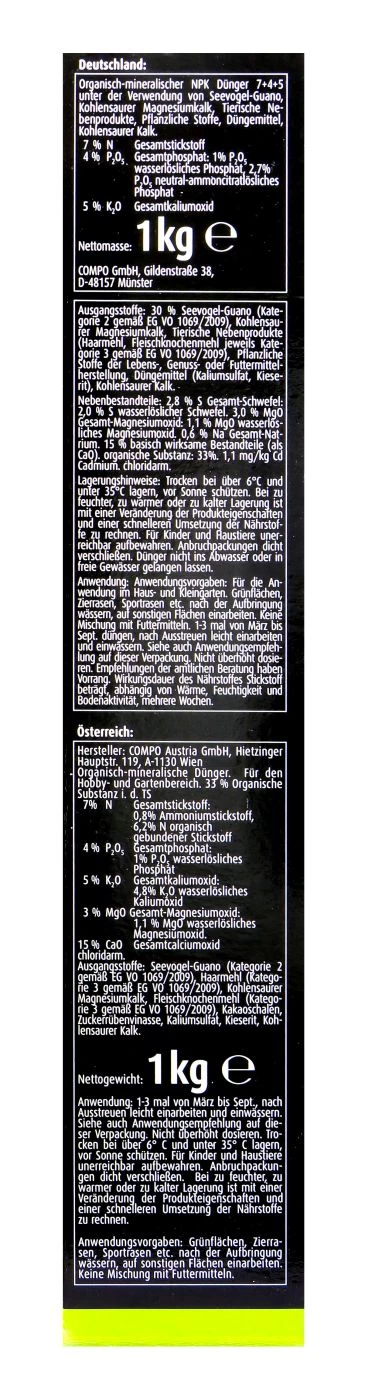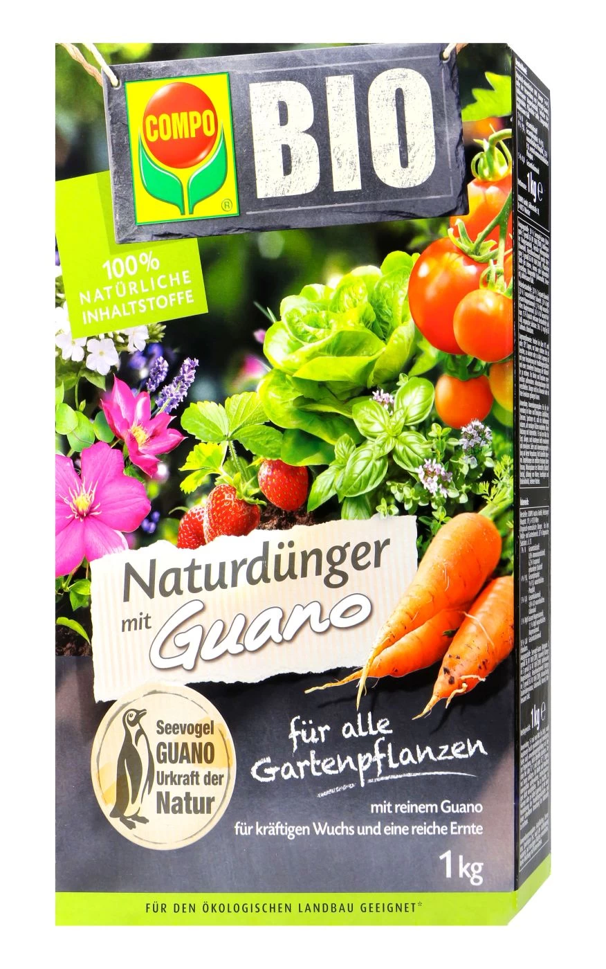 Compo Bio bietet dir einen Natürdünger mit 70% reinem Guano. Guano besteht zum großen Teil aus Exkrementen von Seevögeln. Diese beinhalten wertvolle Nährstoffe für deine Pflanzen, damit diese kräftig wachsen.
