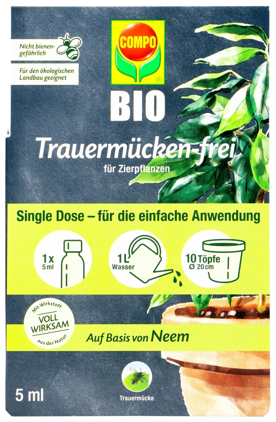 Du kannst das Mittel für deine Zierpflanzen im Haus nutzen. Compo Bio Trauermücken-Frei ist nicht bienengefährlich.