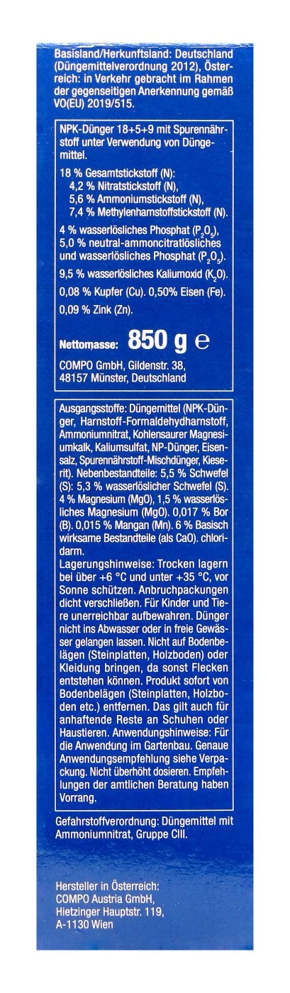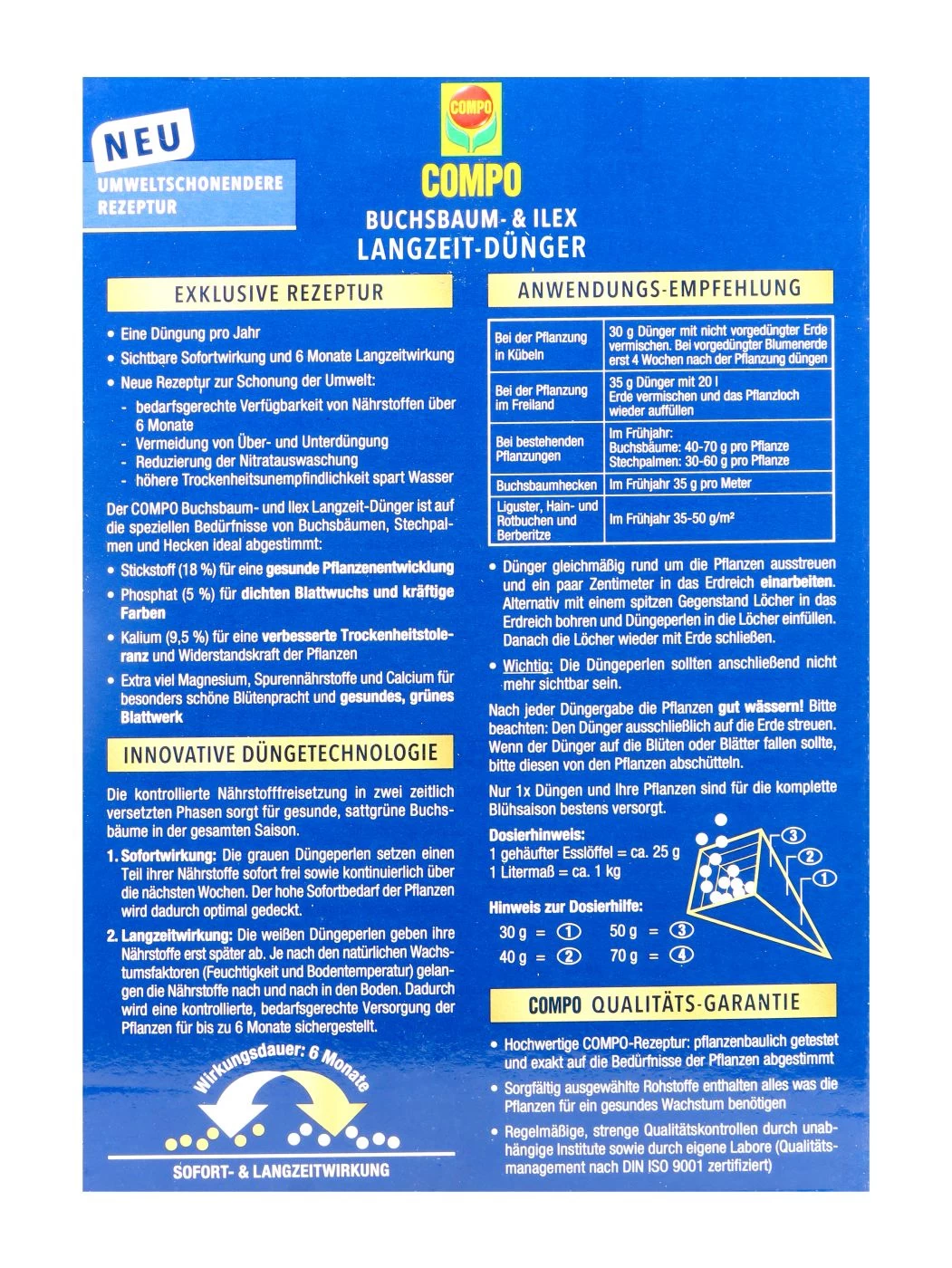 Buchsbäume sind ein bisschen ernährungswahnsinnig und achten besonders auf ihre Linie. Deswegen kümmer dich gut um sie und sorge für ein ausgewogenes Nährstoffverhältnis. Compo Buchsbaum Langzeit-Dünger enthält alles, was deine Buchsbäume, Hecken und Sträucher benötigen. 16% Stickstoff sorgen für ein kräftiges Wachstum, 13,5% Kalium für einen dichten Blattwuchs und kräfige Fabe und zahlreiche Spurennährstoffe machen die Pflanze widerstandsfähiger.