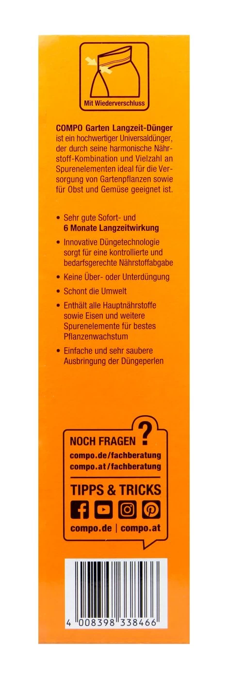 Ein Star unter den Düngemitteln! Der Compo Garten Langzeit-Dünger ist ein Allround Talent. In ihm stecken eine Vielzahl an Spurenelementen und Nährstoffen, durch die sich deine Pflanzen kräftig und gesund entwickeln. Zuerst werden die grünen Patienten sofort mit den wichtigsten Nährstoffen versorgt und anschließend langfristig immer wieder mit dem Folgebedarf eingedeckt. Und das für bis zu 6 Monate, sodass einmal düngen für eine Saison ausreichend ist.