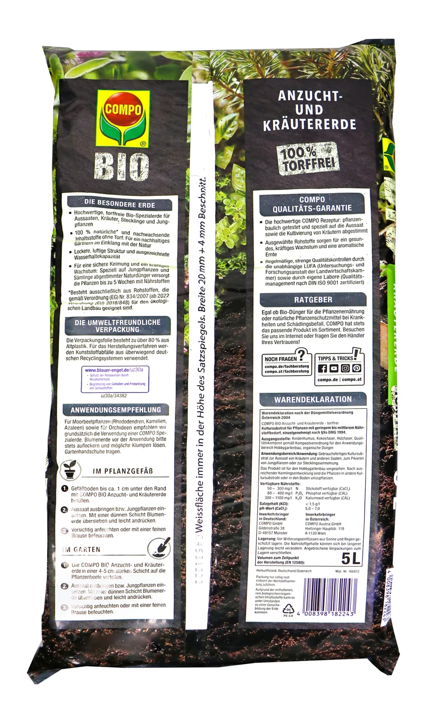 Du bist voller Tatendrang und immer ganz vorne mit dabei? Dann ist die Compo Sana Anzucht- und Kräutererde perfekt für dich. Schnapp dir ein paar Samen und zieh deine eigenen Pflanzen und Kräuter auf. Die Erde enthält alle wichtigen Stoffe für die ersten 6 Wochen, sodass du nicht viel Arbeit hast.