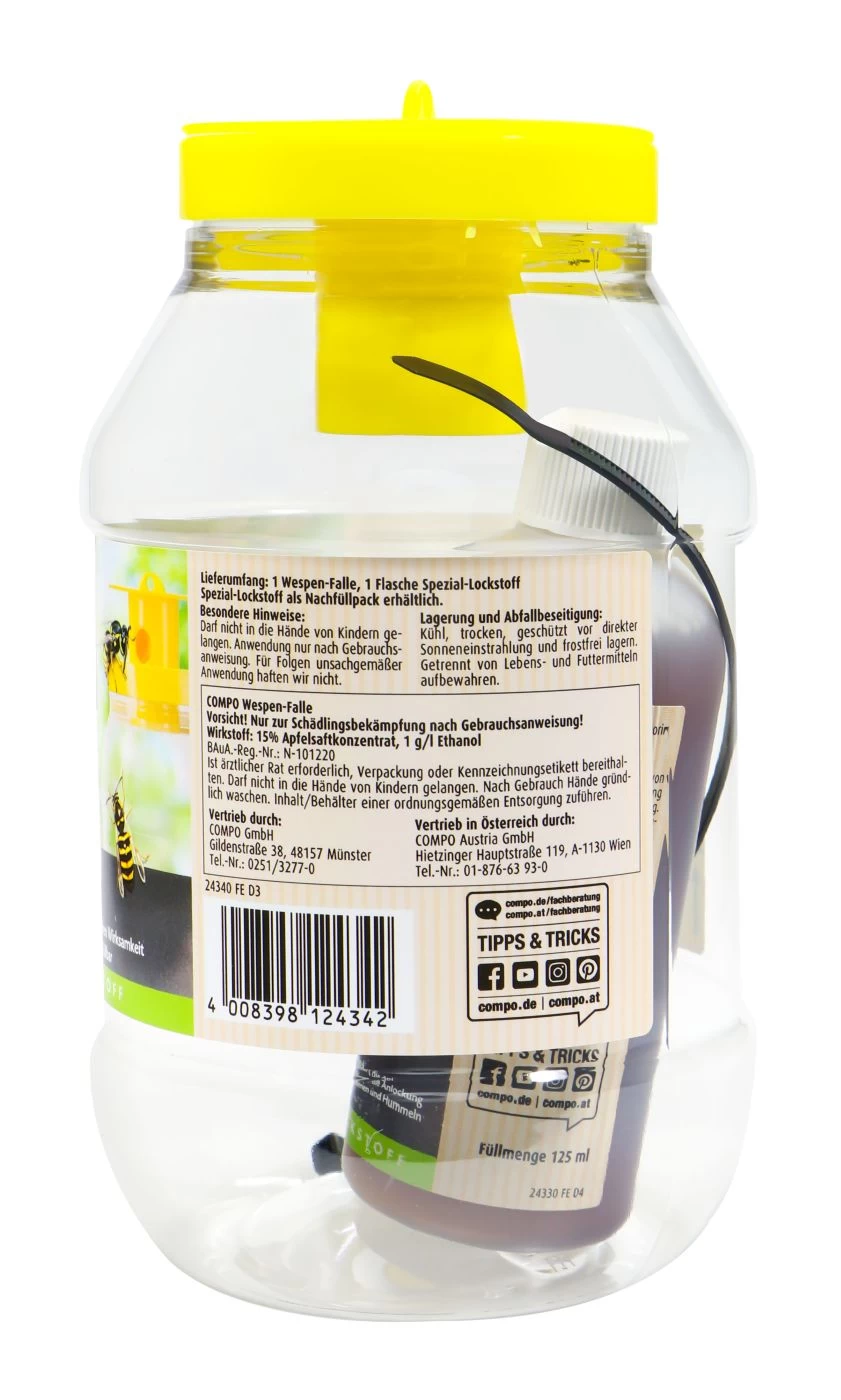 Gelber Angriff auf dem Balkon! Wenn Wespen sich auf den Weg zu deiner Terrasse machen, ist deine Cola, dein Stück Kuchen oder auch dein vierbeiniger Freund wohlmöglich in Gefahr. Abhilfe schafft die Wespen-Falle von Compo. Diese ist mit einem Lockstoff versehen, der die Wespen anlockt und in der Falle hält. Das Produkt zum Monitoring des Wespenaufkommens ist insektizidfrei. Die Wirkung des Lockstoffes wirkt bis zu 3 Wochen.