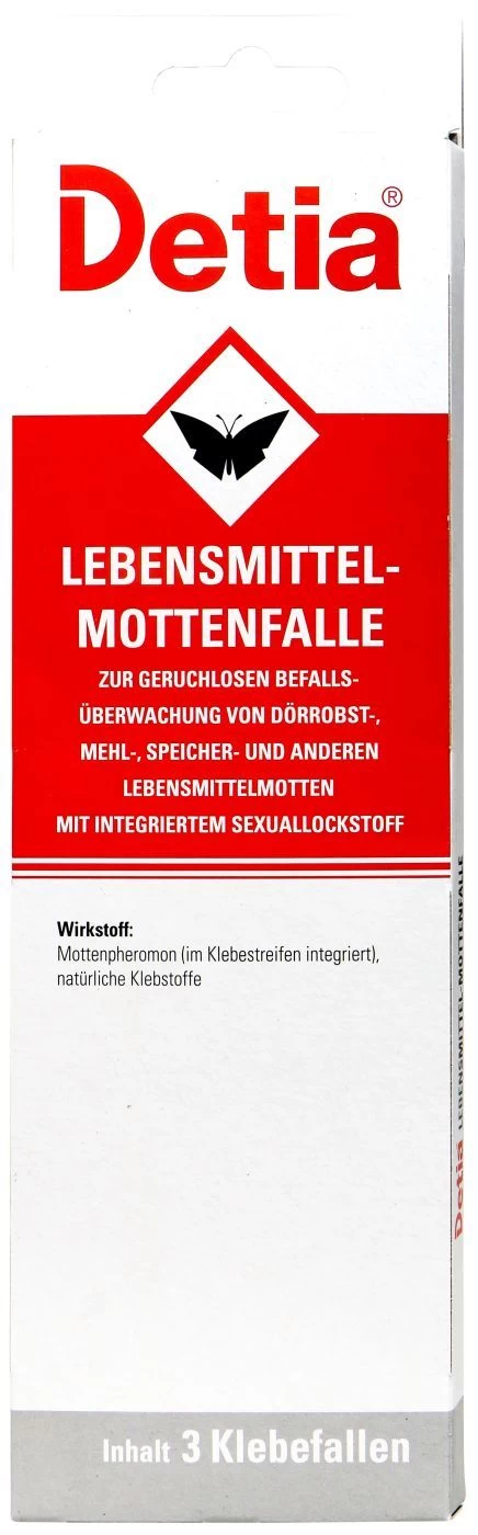 Wocheneinkauf getan und alles ist wieder vorrätig. Obst, Gemüse, Mehl. Am nächsten Tag gehst du in die Küche und traust deinen Augen kaum. Da krabbelt was zwischen deinen neuen Lebensmitteln umher. Motten! Um genauer zu sein Lebensmittelmotten. Mit der Detia Lebensmittel-Motten-Falle setzt du dem Horror ein Ende. Die Falle funkioniert ganz ohne Insektizide. Die Männchen werden durch einen Sexuallockstoff angezogen und bleiben auf der Klebefläche kleben. So können die Weibchen sich nicht mehr vermehren und du kannst den Befall kontrollieren.