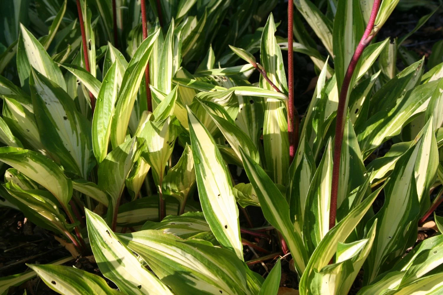 Aus dem Repertoire an Blattschmuckqualitäten bedient sich diese außergewöhnlich dekorative Funkie großzügig und ungeniert. Mit ihren länglichen, spitz zulaufenden Blättern, deren cremeweiß geflammte Mitte ein breiter, grüner Rand umschließt, sowie mit den dunkelroten Blatt- und Blütenstielen ist Hosta ‚Cherry Berry‘ eine vornehme Attraktion im Schattengarten.