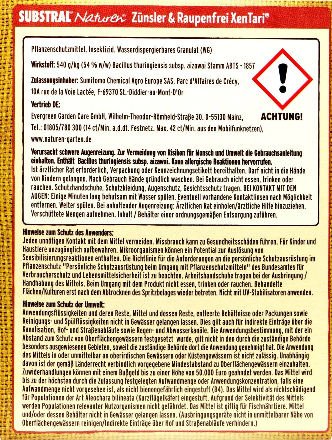 Naturen Bio Zünsler & Raupenfrei XenTari besteht zu 100% aus einem biologischen Wirkstoff. Diesen kannst du auf all deine Zier-, Obst,- und Gemüsepflanzen sowie Wein anwenden.
