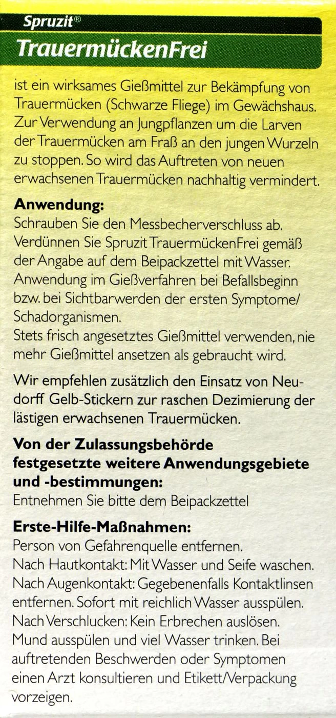 Neudorff Spruzit TrauermückenFrei nutzt genau diese Wirkstoffe, um gegen zahlreiche saugende und beißende Insekten vorzugehen. Neem wirkt sich auf die Wachstumsregulatoren der Larven aus und unterbindet die Entwicklung zu einem ausgewachsenem Insekt.