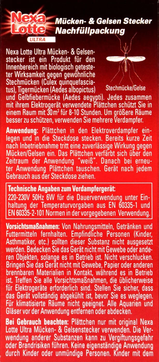 Von Nexa Lotte Ultra gibt es einen Mücken & Gelsen Stecker, der schnell und geruchslos auf den ganzen Raum (30m²) wirkt.