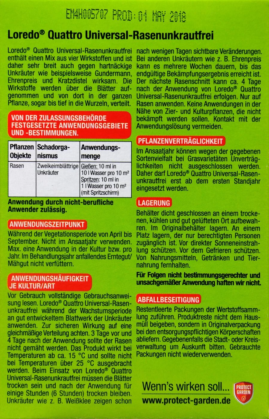 Gänseblümchen, Löwenzahn, Fingerkraut…dein Garten blüht in einer herrlichen Farbenpracht. Alles schön und gut, doch eigentlich ist das gar nicht gewollt. Du hättest lieber einen schönen, grünen, saftigen Rasen? Dann greif zu Loredo Quattro Universal-Rasenunkrautfrei von Protect Garden. Durch seine 4-fach Wirkung ist das Mittel besonders stark, auch gegen hartnäckige Unkräuter. Für deinen Rasen ist das ganze sehr gut verträglich. Und bald hast du deine langersehnte grüne Wiese.
