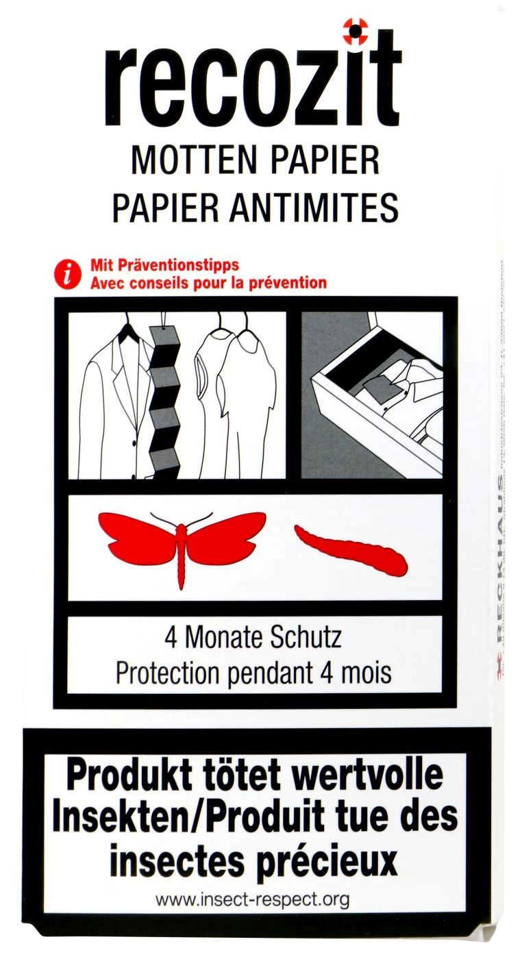 Jetzt ist es Zeit Recozit Mottenpapier in den Schrank zu hängen. Das Mittel bekämpft nachhaltig Motten, inklusive deren Brut, aber auch Silberfische und andere Insekten.