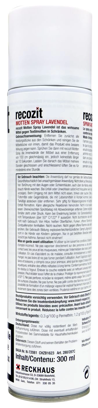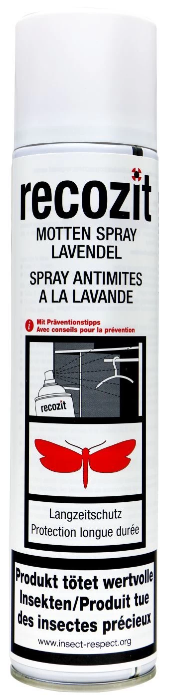 Recozit Motten Spray Lavendel macht genau dies. Du sprühst die Innenwände deines Kleiderschrank ein, lässt es einwirken, lüftest ordentlich und hast langfristig Ruhe vor diesen Schädlingen.