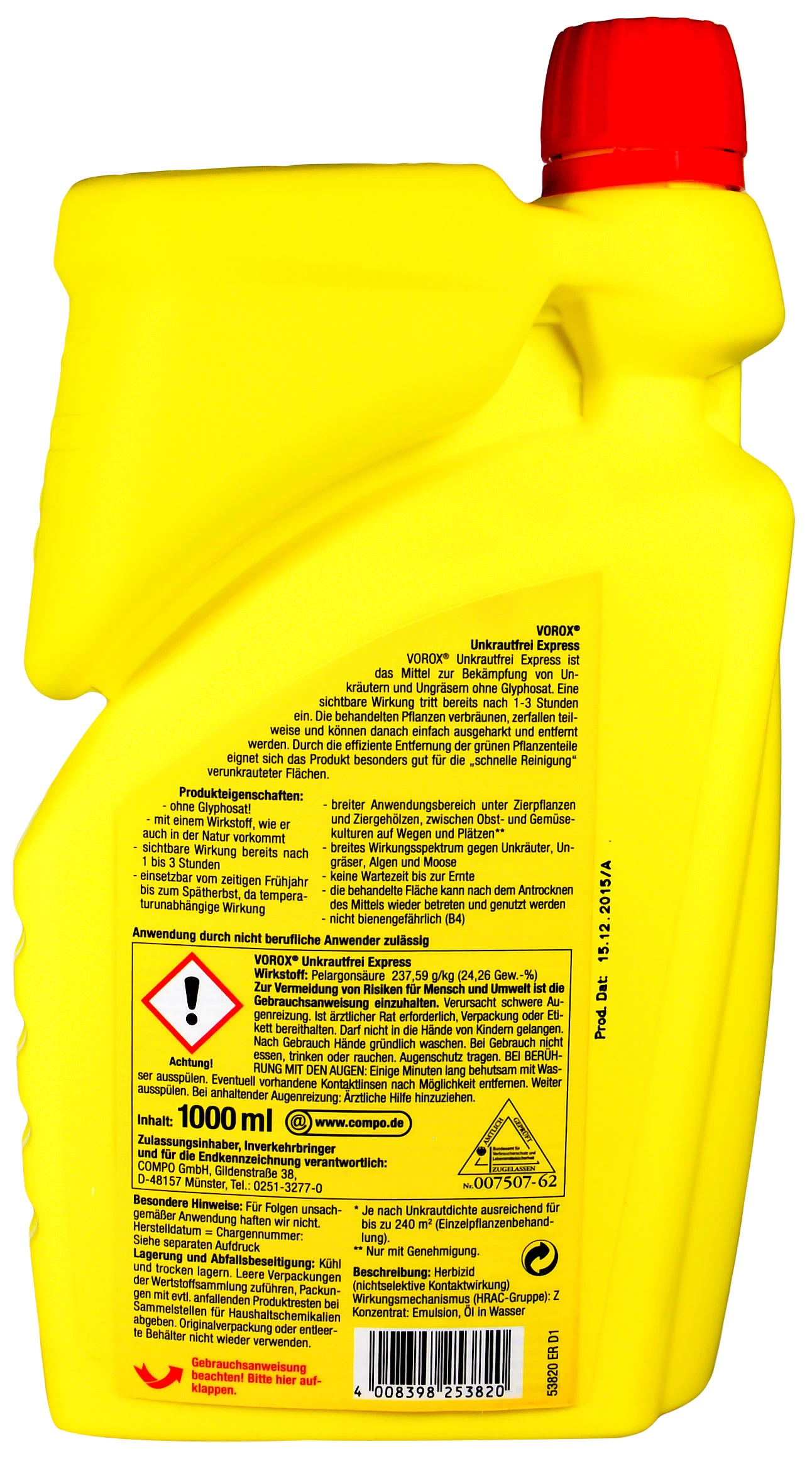 Jetzt aber schnell. Der Unkrautfrei Express von VOROX ist DER Unkrautvernichter für die Eiligen unter uns. Die Wirkung tritt bereits nach 1-3 Stunden auf. Und es kommt noch besser. Die behandelten Pflanzen werden braun und zerfallen sogar zum Teil, sodass man diese einfach ausharken kann.